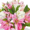 ЛЮКС: роза белая - 7 шт., лилия розовая - 3 шт., декоративная зелень, сетка розовая, бант розовый.