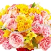 Уменьшенный: роза розовая - 5 шт., роза кустовая желтая - 2 шт., альстромерия желтая - 1 шт., гвоздика одноголовая розовая - 5 шт, фетр розовый, бант розовый, + коробка конфет в подарок.