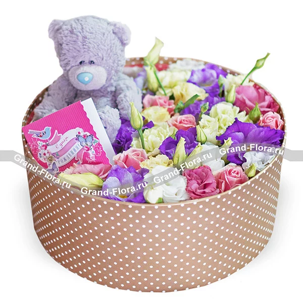Стандартный: эустома синяя - 1 шт., эустома розовая - 1 шт., роза кустовая белая - 2 шт., роза кустовая розовая - 1 шт., оазис, мишка Тедди, коробка.