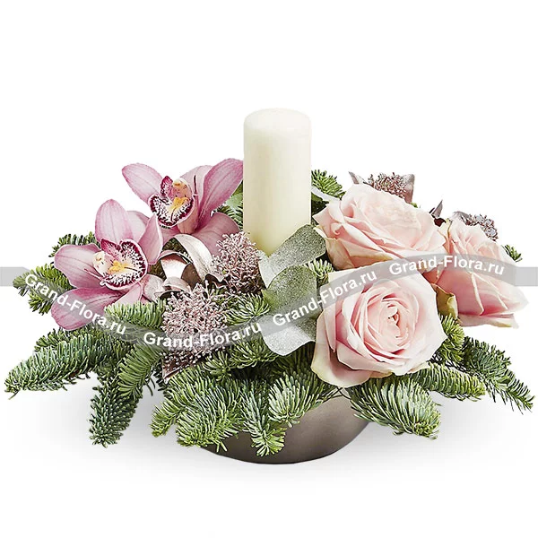 Стандартный: орхидея розовая - 2 шт., роза розовая - 3 шт., декоративная зелень, ель, свеча, оазис, коробка.