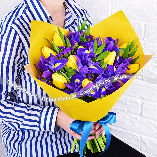 Стандартный: тюльпан желтый - 6 шт., ирис синий- 5 шт., статица, упаковка, лента.