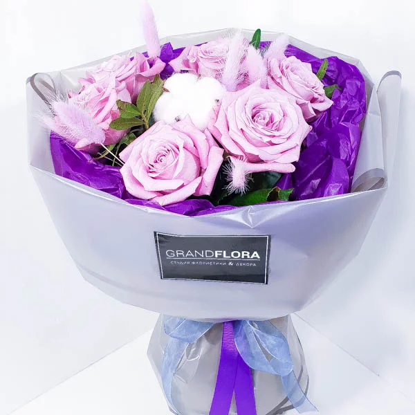 "Лиловое настроение" - это букет, который прекрасно подходит для подарка любимому человеку или для декора интерьера. Цветочная композиция состоит из роскошных сиреневых роз, которые прекрасно сочетаются с мягким и абсолютно нежным хлопком. Букет оформлен в яркой фиолетово-серой упаковке, которая добавляет ему дополнительную изюминку и стиль. Этот букет идеально подходит для любого праздника или специа