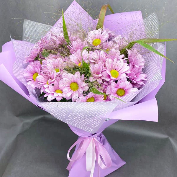 Букет "Нежный поцелуй"- это идеальное сочетание красоты и нежности, созданное специально для тех, кто хочет выразить свои чувства и проявить нежность. В этом букете использованы красивые и свежие розовые кустовые хризантемы, которые идеально дополняются зелеными листьями, создавая неповторимый и роскошный аромат. Хризантемы известны своей красотой и символикой любви и нежности, и этот букет идеально подходит для дня вашей годовщины, дня рождения или любого другого специального случая, когда вы хотите проявить свою любовь и заботу. Этот букет также может стать идеальным выбором для признания в дружбе или благодарности. Он будет напоминать о вашей любви и нежности на долгое время."