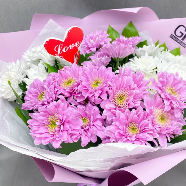 5 хризантем: хризантема кустовая белая - 3 шт., хризантема кустовая розовая  - 2 шт.,  декор сердечко , упаковка, лента