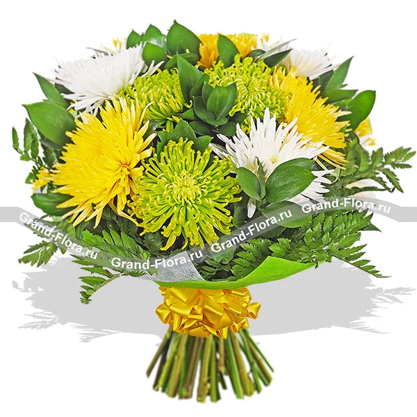 Милый букет без претензий на ВИП, тем не менее, будет отличным украшением любого дома, за счет своей свежести, простоты и цветовой гаммы. Нежный аромат трех сортов хризантем не вскружит голову, но подарит ощущения покоя, умиротворенности и домашнего уюта. А что еще надо для семейного счастья? Ну разве только коробку изысканных конфет «Коркунов», которые вы можете заказать у нас в месте с букетом.